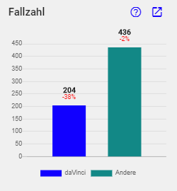 Der erste blaue Balken zeigt die Anzahl der Fälle für die ausgewählten Fachabteilungen, die mit dem daVinci-System operiert wurden.